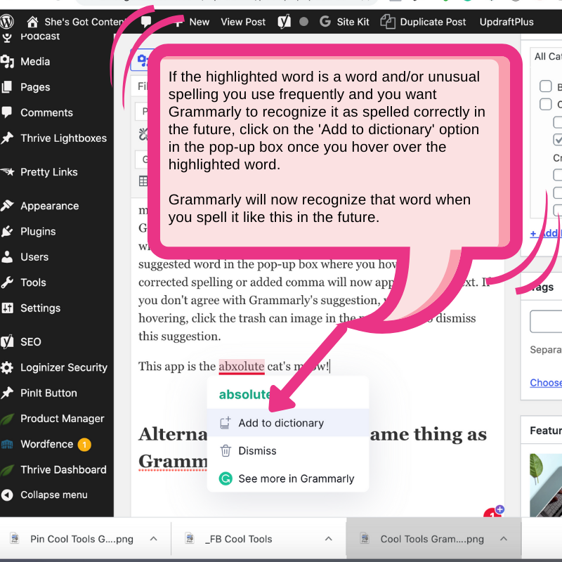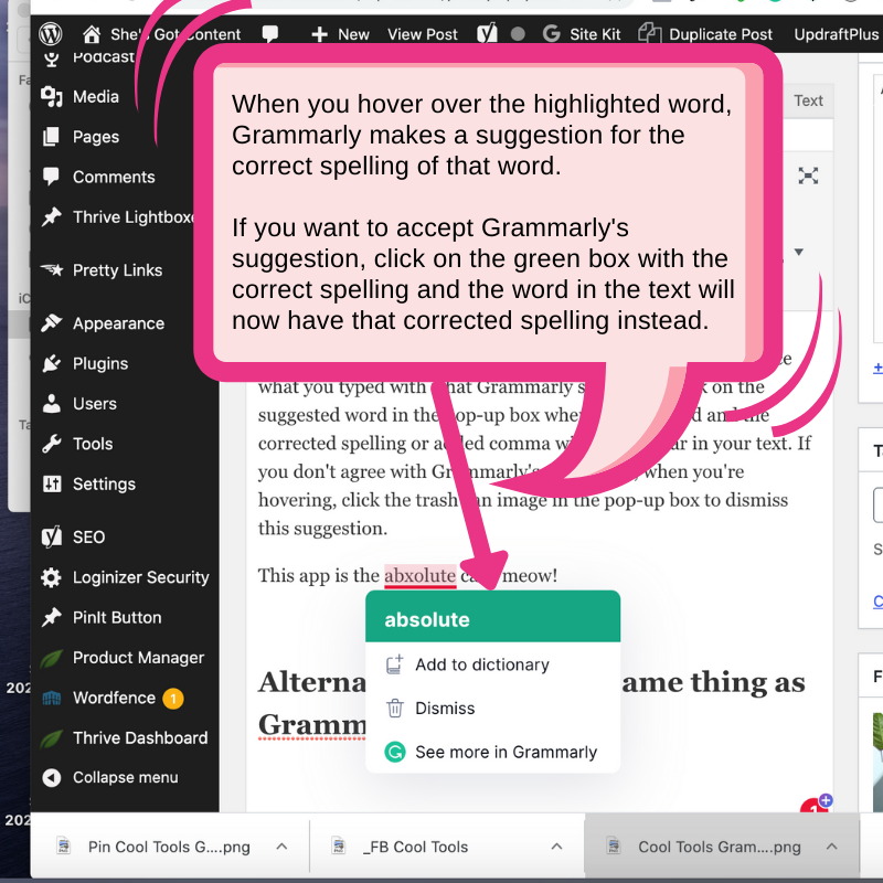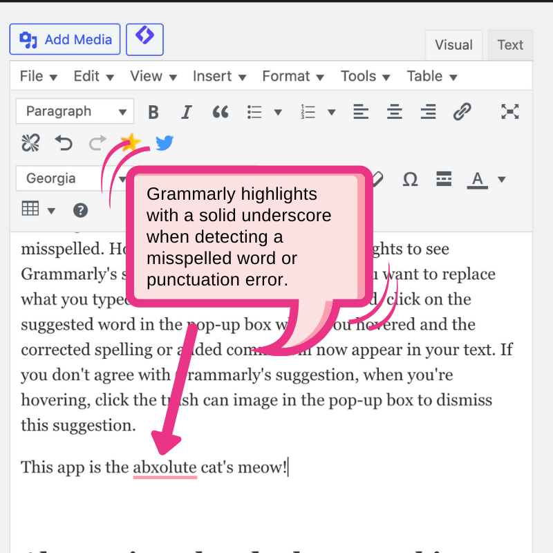 Once it’s set up, you’ll begin noticing that Grammarly will underline words in your text it thinks are misspelled. Hover your cursor over those highlights to see Grammarly’s suggestions to replace them.